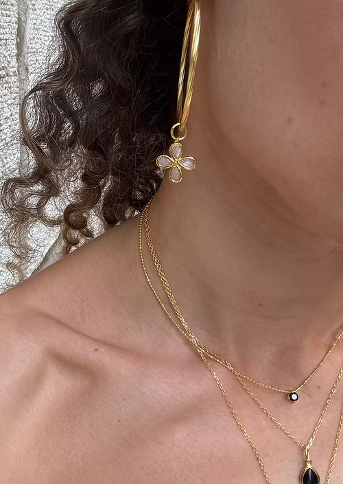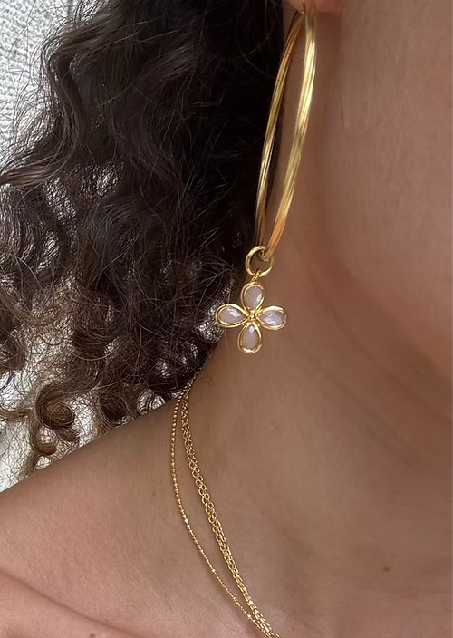 Diese schönen Kreolen aus vergoldetem Silber haben einen Durchmesser von 5cm und eine Mondsteinblume als Anhänger.