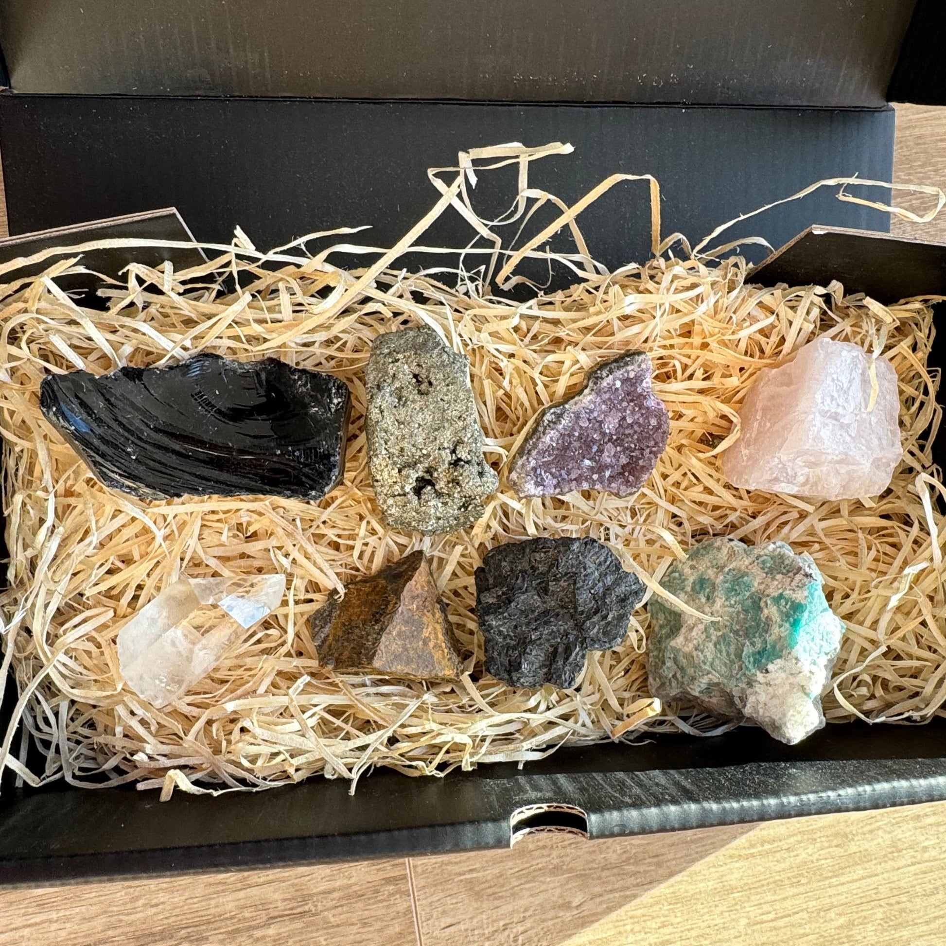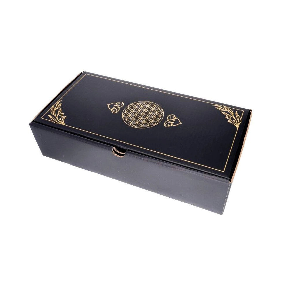 Mit dieser Box erhältst du 8 wunderschöne, essentielle Edelsteine in einer wunderschönen Box mit der Prägung "Blume des Lebens".