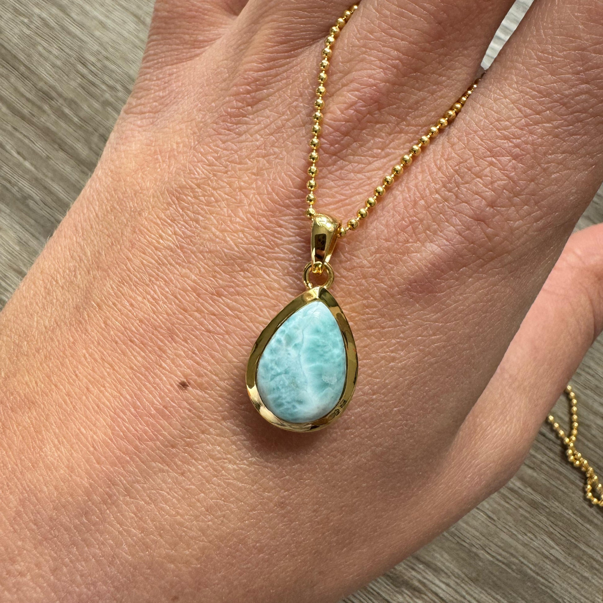 Diese schönen Halskette besteht aus vergoldetem Silber und hat einen Larimar Anhänger.