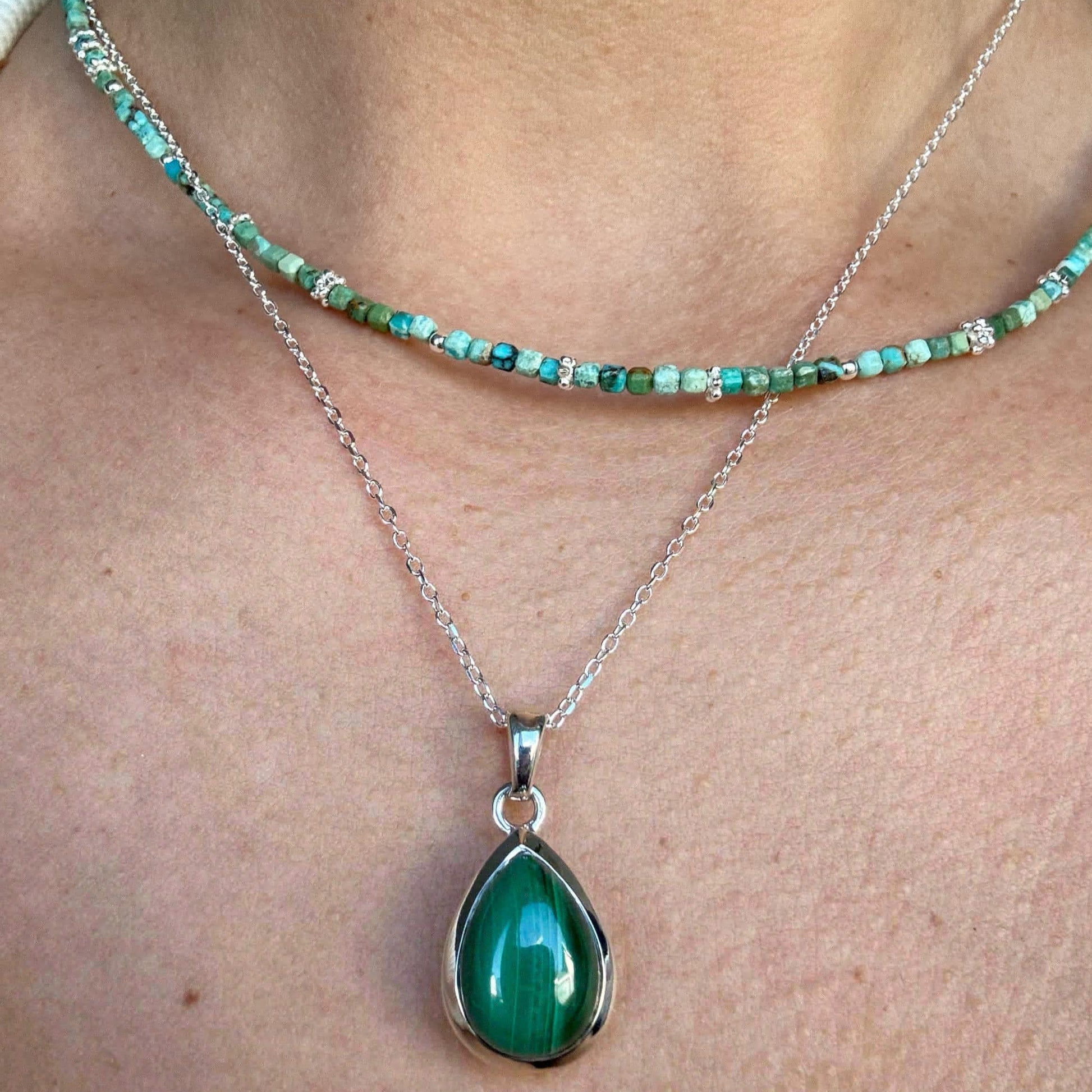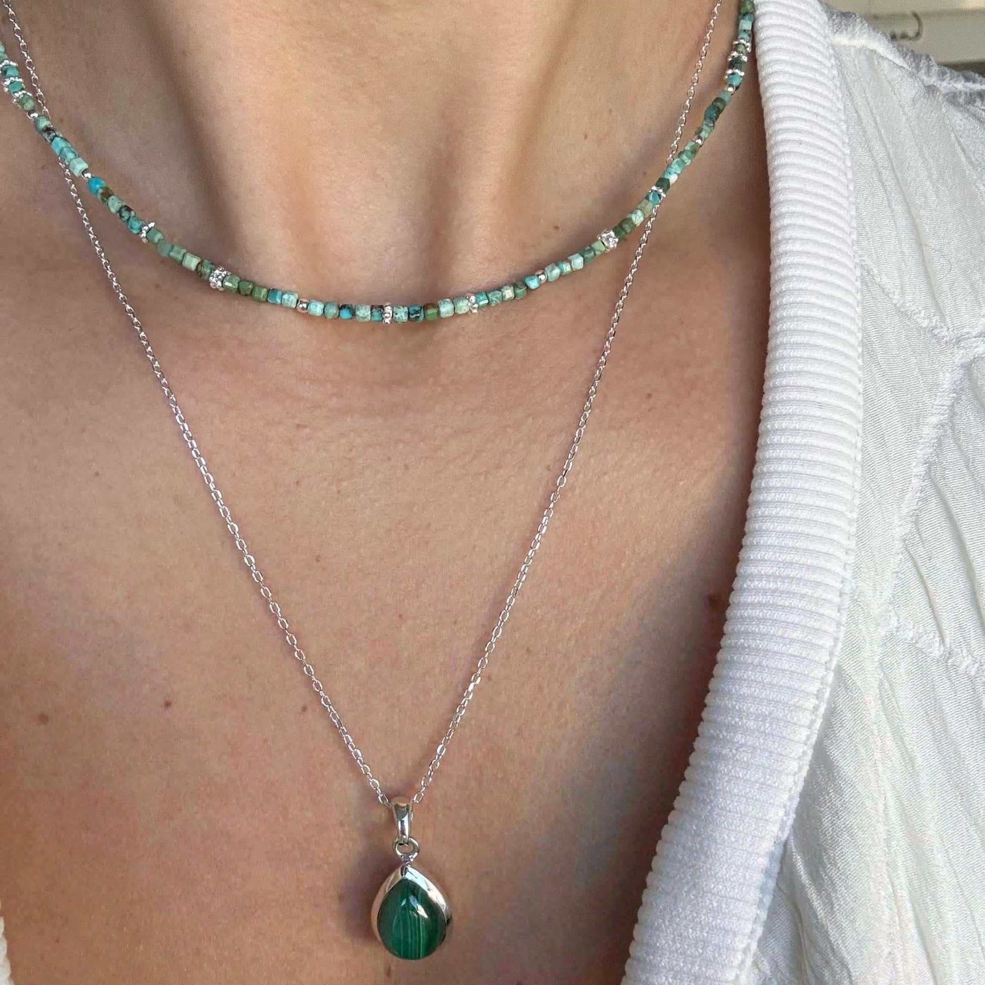 Die obere Kette besteht aus 2mm Türkisperlen und Silberelementen dazwischen. Sie hat eine Länge von 40-44cm. Die längere Kette ist mit dem Edelstein Malachit angefertigt worden. Der Anhänger hat die Masse 15 auf 12mm. Die Kette hat eine Länge von 50-55cm.
