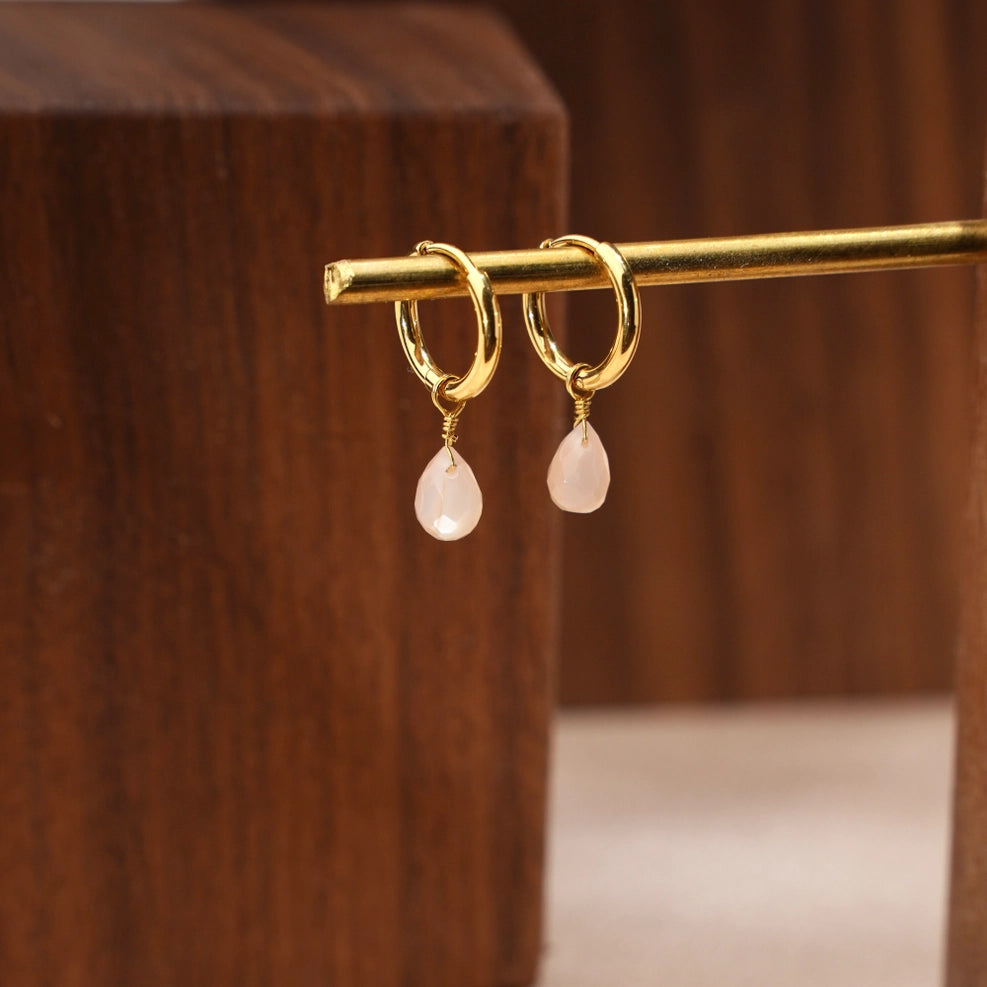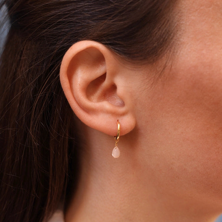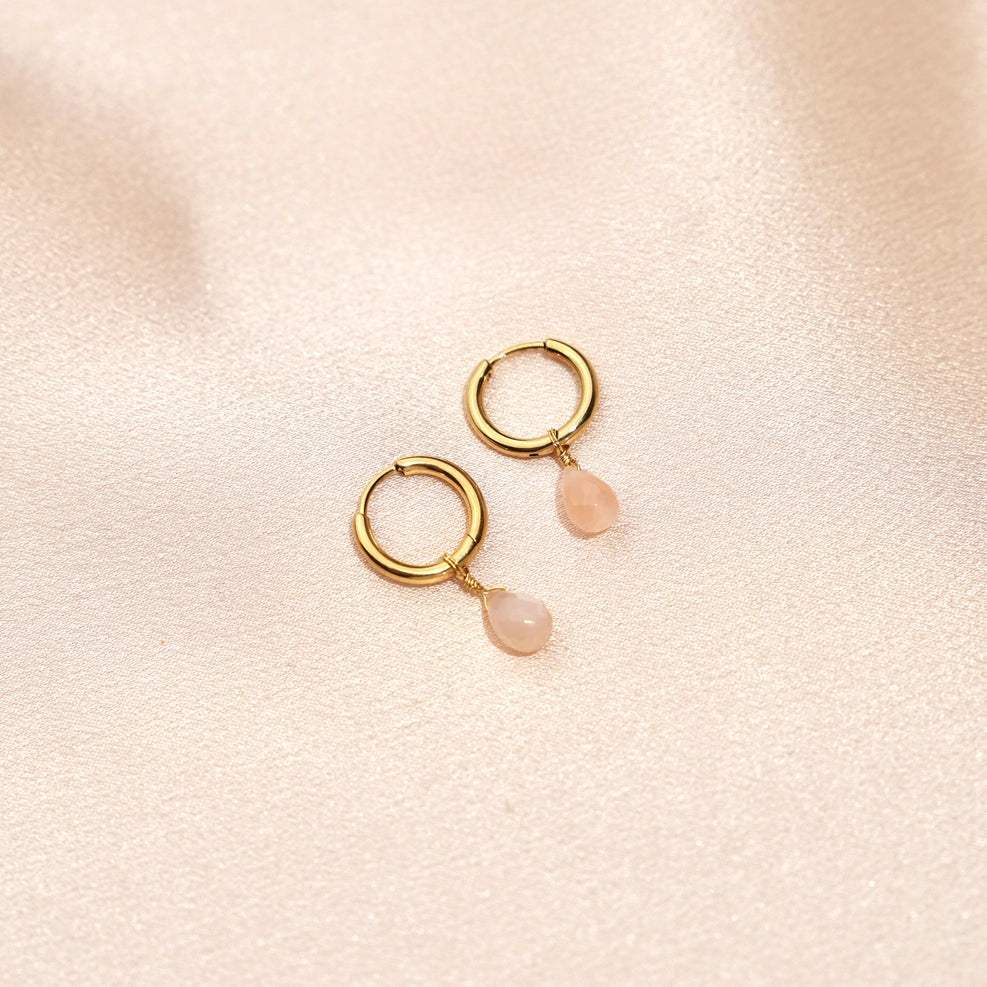 Diese kleinen Creolen aus Edelstahl haben kleine tropfenförmige Anhänger aus Rosenquarz.