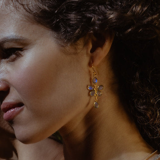Diese schönen Ohrringe in Schmetterlingform wurden aus Sterling Silber (auch vergoldet) und dem Edelstein Mondstein angefertigt. Sie sind 35 auf 16mm gross und sehr leicht im Gewicht. Dadurch, dass die Steine einen starken Schimmer haben, funkeln sie richtig schön am Ohr.