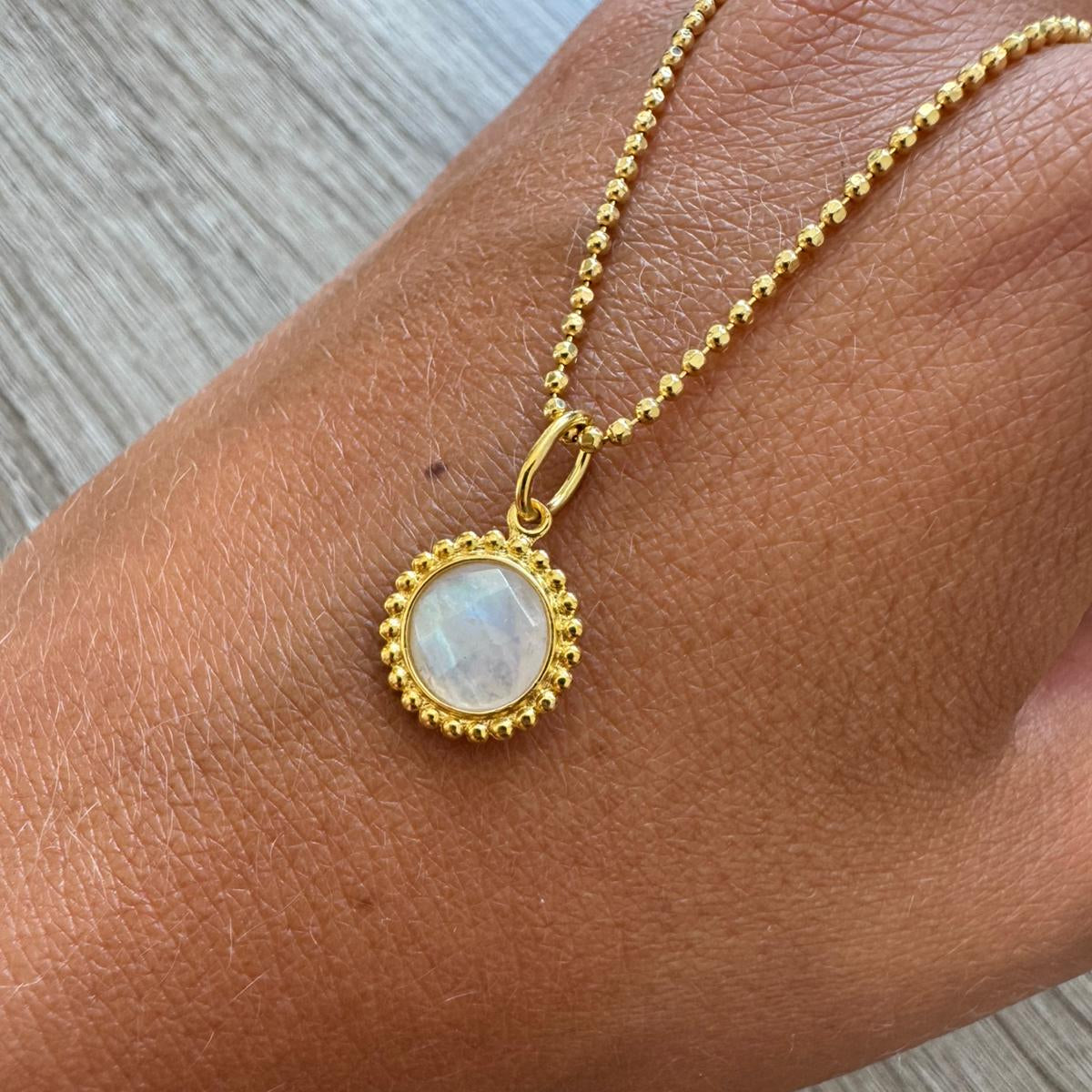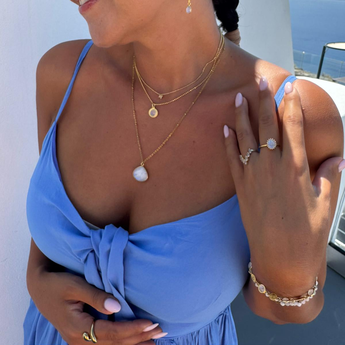 Die obere Diamantmondsteinkette und die untere Kette mit großen Mondstein sind ebenfalls im Shop zu finden, ebenso wie die Ohrringe, der Armschmuck und die Ringe.