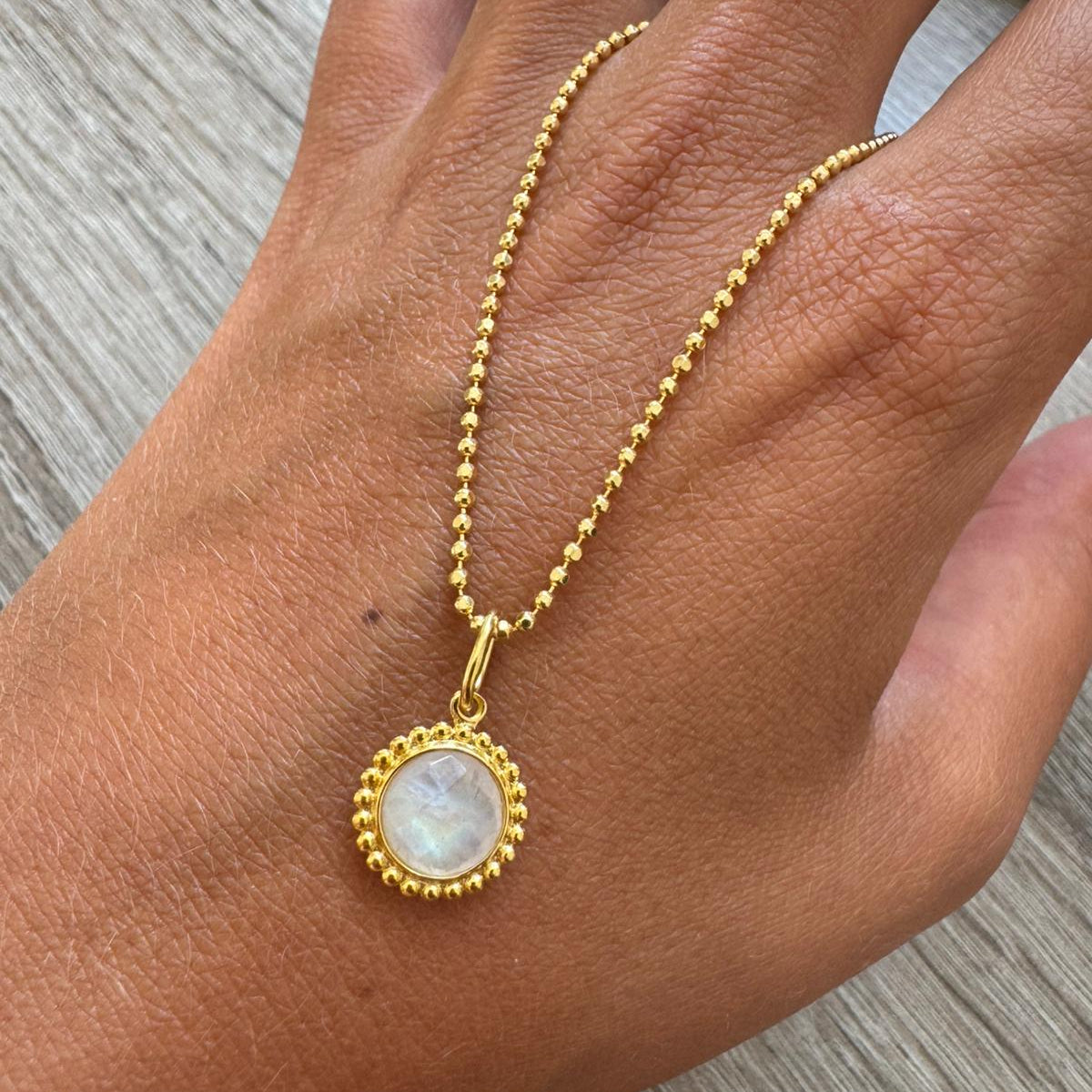 Diese schöne Halsketten wurden aus vergoldetem Silber und dem Edelstein Mondstein angefertigt. Sie hat eine Länge von 40cm.