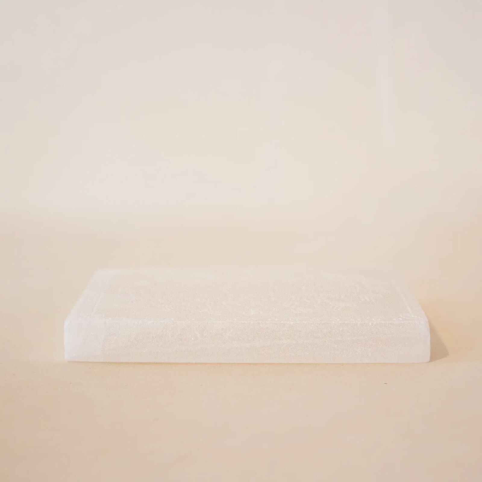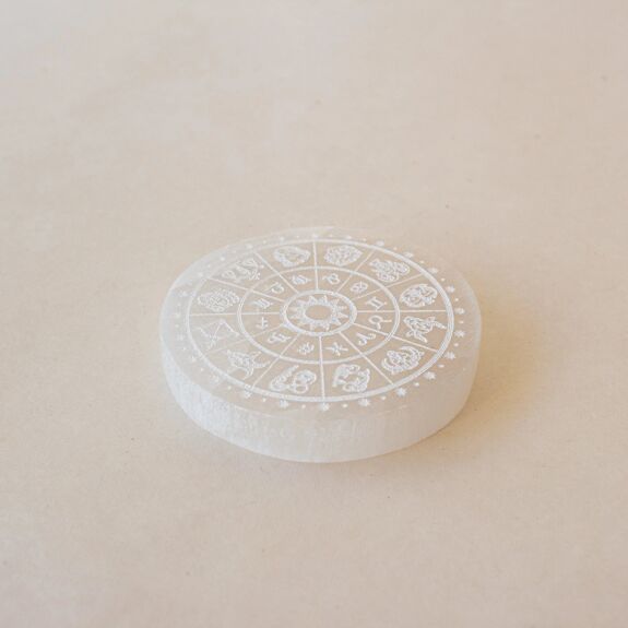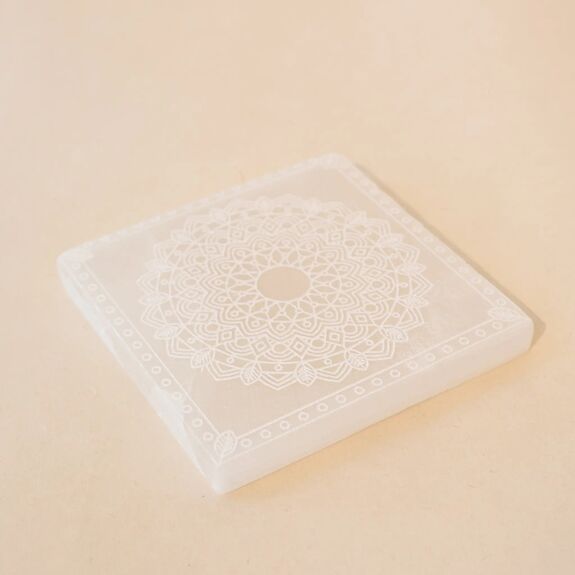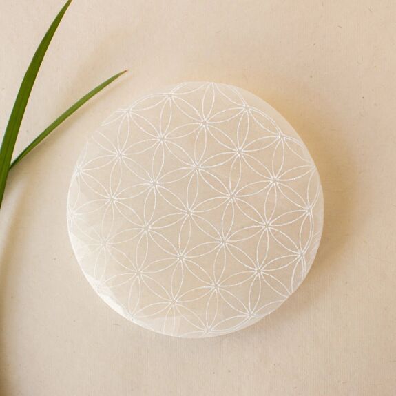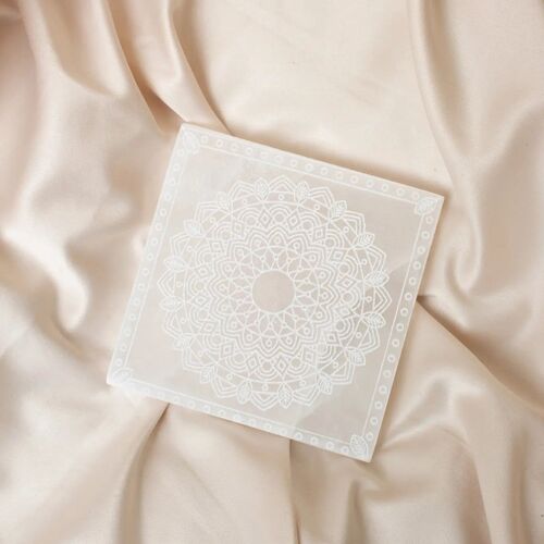 Mit einem wunderschönen Mandala-Muster eignet sich diese Ladeplatte aus Selenit perfekt zum Reinigen und Aufladen Ihrer Edelsteine.